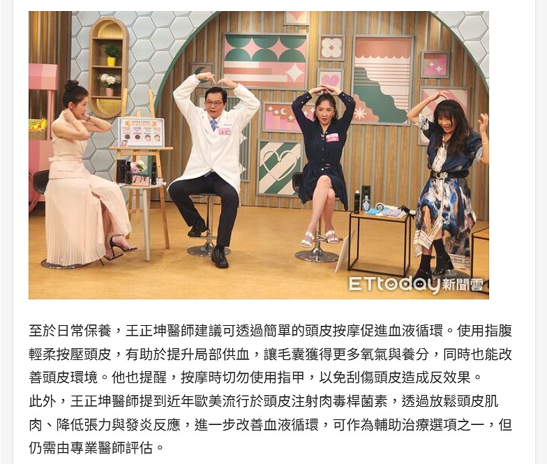 此外,王正坤醫師提到近年歐美流行於頭皮注射肉毒桿菌素,透過放鬆頭皮肌肉、降低張力與發炎反應,進一步改善血液循環,可作為輔助治療選項之一,但仍需由專業醫師評估。