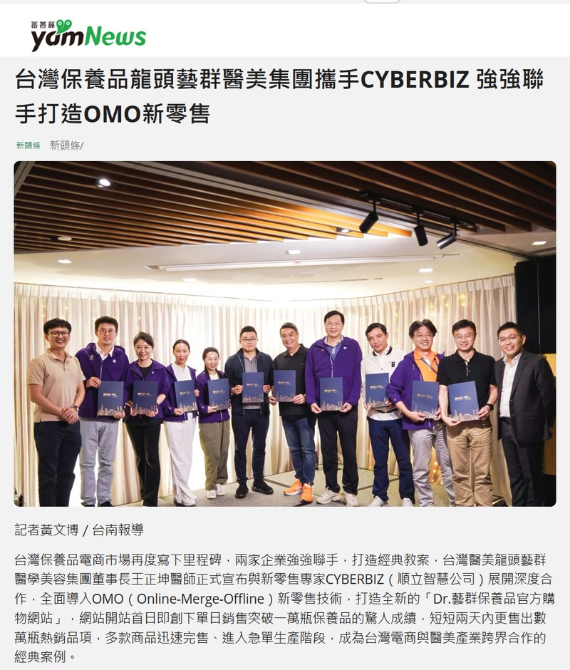 台灣保養品龍頭藝群醫美集團攜手CYBERBIZ 強強聯手打造OMO新零售 -新頭條-享新聞-睿傳媒-yamNews新聞-奧丁丁新聞-在地人新聞LTVNews-coolbar Life生活誌-GOTHE 走.遊-屏東時報電子報-勢傳媒-台南時報