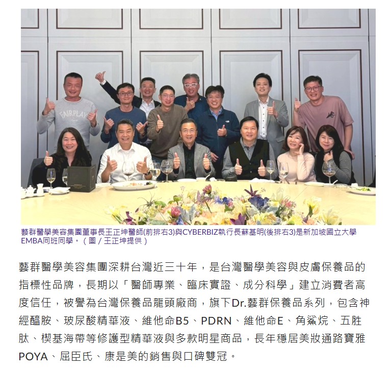 促成此次跨界合作的重要關鍵之一,來自雙方最高領導人之間深厚的同窗情誼與信任。藝群醫學美容集團董事長王正坤醫師與CYBERBIZ執行長蘇基明,同為新加坡國立大學(NUS)商學院EMBA同班同學。NUS長年位居亞洲大學排名第一,是全球華商與企業領袖培育的搖籃,校友遍布亞洲各大產業核心。