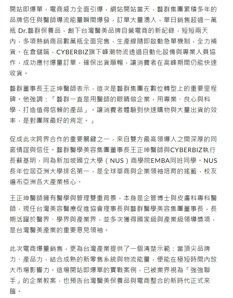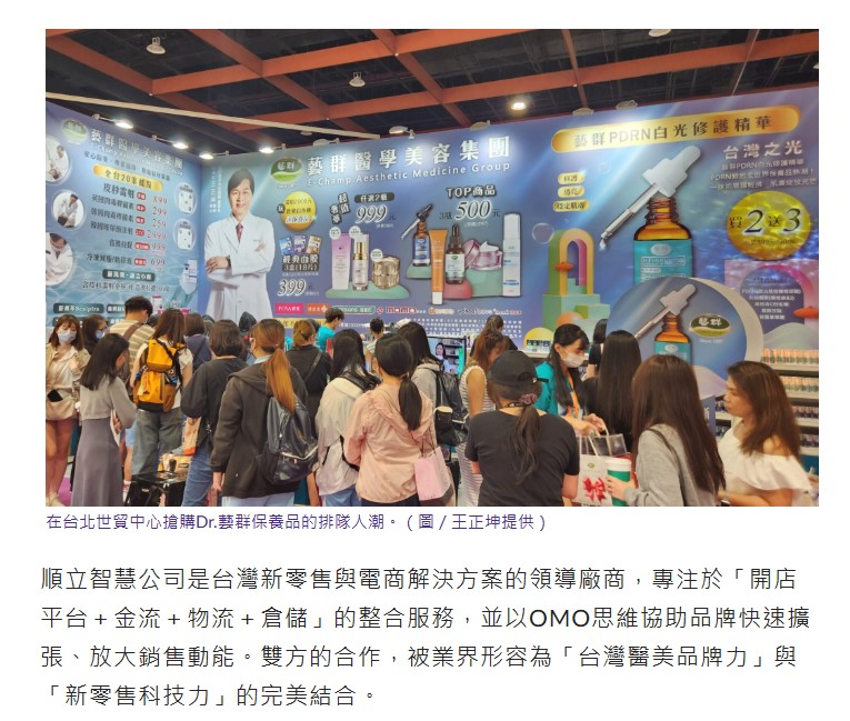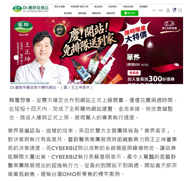 台灣保養品電商市場再度寫下里程碑,兩家企業強強聯手,打造經典教案,台灣醫美龍頭藝群醫學美容集團董事長王正坤醫師正式宣布與新零售專家CYBERBIZ(順立智慧公司)展開深度合作,全面導入OMO(Online-Merge-Offline)新零售技術,打造全新的「Dr.藝群保養品官方購物網站」,網站開站首日即創下單日銷售突破一萬瓶保養品的驚人成績,短短兩天內更售出數萬瓶熱銷品項,多款商品迅速完售、進入急單生產階段,成為台灣電商與醫美產業跨界合作的經典案例。