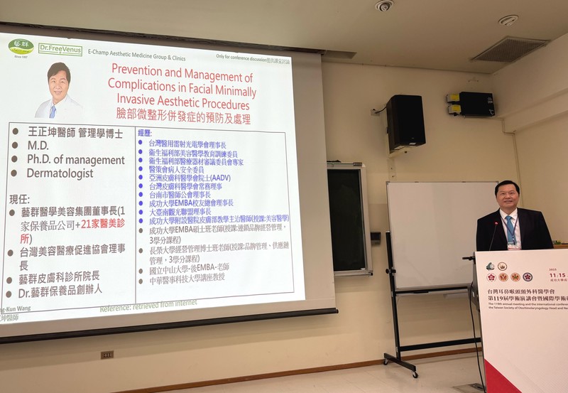 隨著醫學美容療程的普及與市場需求的快速成長,如何在追求美麗的同時確保醫療安全,已成為臨床醫師與患者共同關注的議題。為提升醫師在微整形注射與光電療程中的安全意識與臨床應變能力,台灣耳鼻喉頭頸外科醫學會在成功大學醫學院舉辦第119屆學術研討會,邀請台灣美容醫療促進協會理事長王正坤醫師於11月16日,發表「臉部微整形併發症的預防及處理」專題講座,分享最新國際安全趨勢與臨床防治經驗,並由涂智文醫師與羅盛典醫師擔任座長主持會議。