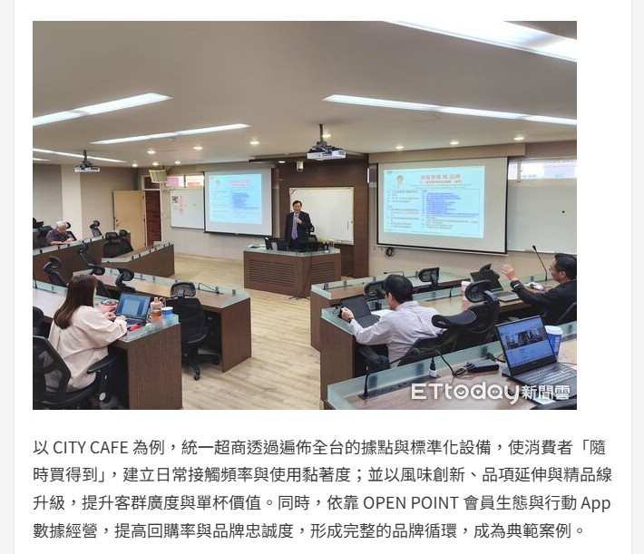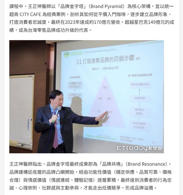 課程中,王正坤醫師以「品牌金字塔」(Brand Pyramid)為核心架構,並以統一超商 CITY CAFE 為經典案例,剖析其如何從平價入門咖啡,逐步建立品牌形象、打造消費者忠誠度,最終在2023年達成約170億元營收,超越星巴克149億元的成績,成為台灣零售品牌成功升級的代表。