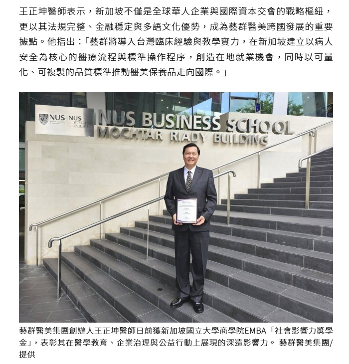 王正坤醫師獲新加坡國立大學EMBA社會影響力獎學金 藝群醫美集團正式啟動新加坡國際布局- 經濟日報