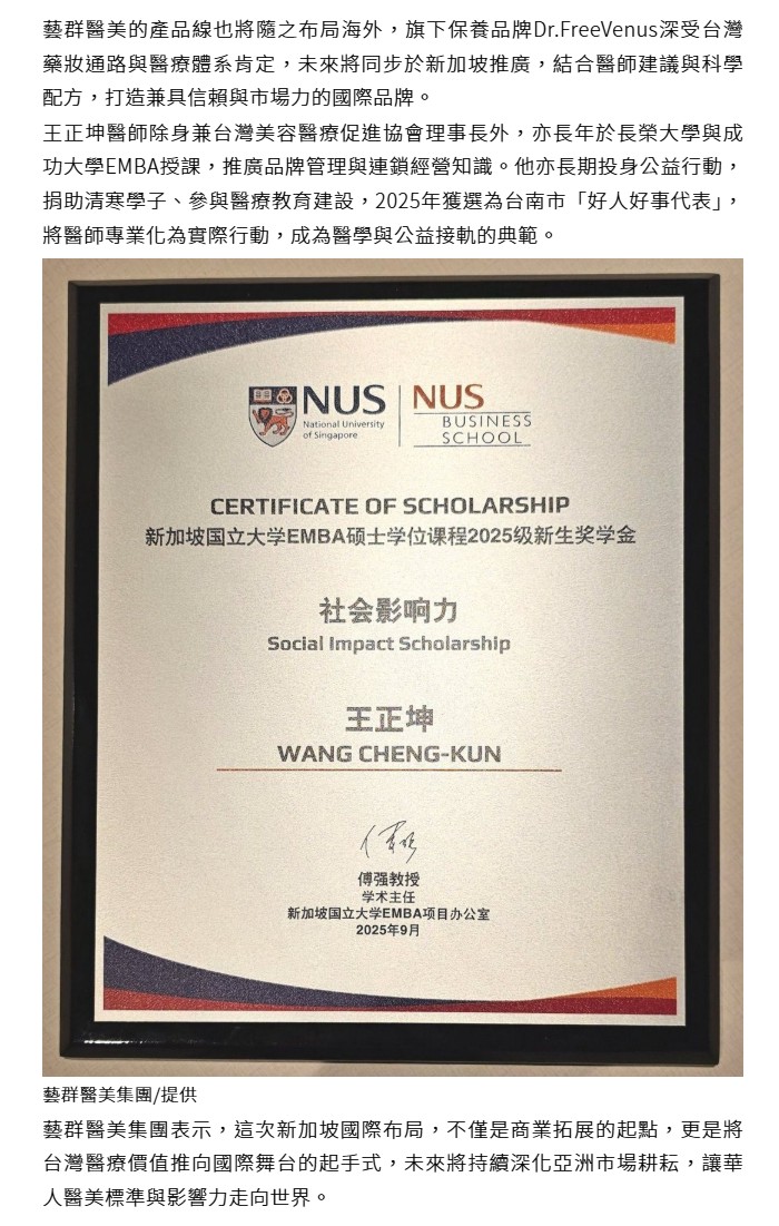 藝群醫學美容集團正式宣佈拓展東南亞市場,首站進軍新加坡,將同步布局醫學美容診所與保養品品牌,打造結合臨床品質與學術培訓的跨國發展平台。集團創辦人王正坤醫師日前獲新加坡國立大學商學院EMBA「社會影響力獎學金」,表彰其在醫學教育、企業治理與公益行動上展現的深遠影響力,由NUS商學院院長Andrew K. Rose與傅強教授親自頒發。