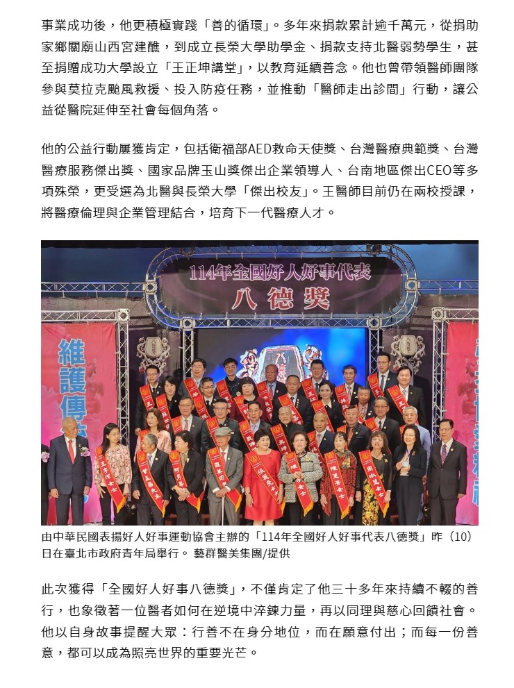 由中華民國表揚好人好事運動協會主辦的「114年全國好人好事代表八德獎」昨(10)日在臺北市政府青年局舉行。今年的得獎名單中,兼具醫界與企業界雙重身分的藝群醫學美容集團董事長王正坤醫師,以長年投入公益、醫療服務與教育支持的深刻貢獻脫穎而出,榮獲全國八德獎,成為醫界與創業界的亮眼榜樣。