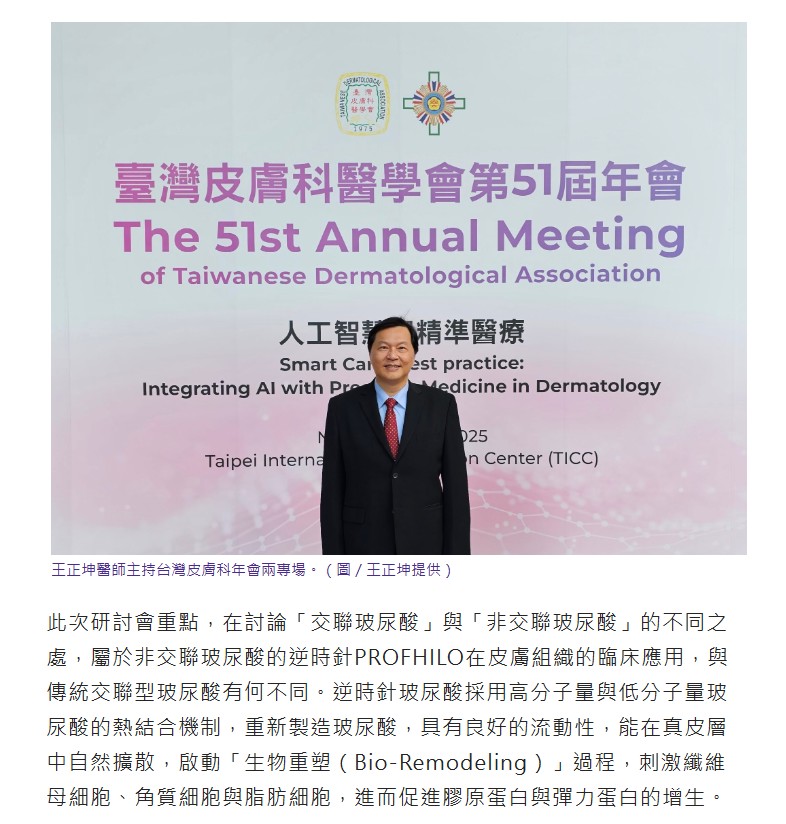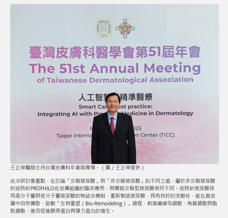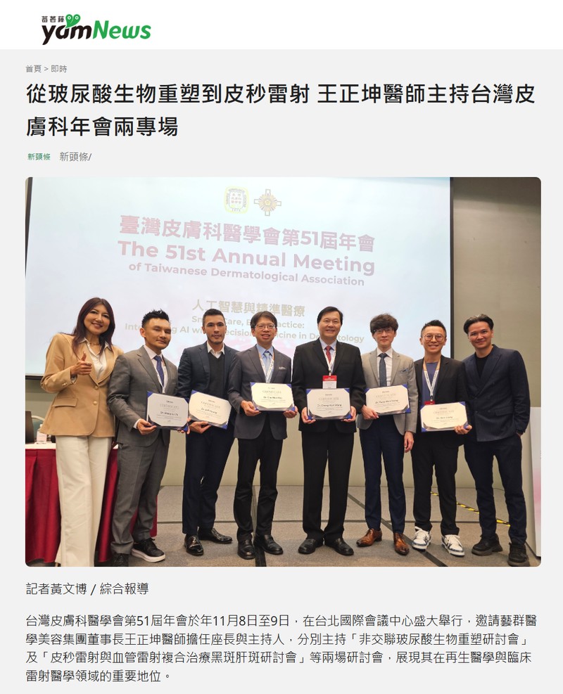 台灣皮膚科醫學會第51屆年會於年11月8日至9日,在台北國際會議中心盛大舉行,邀請藝群醫學美容集團董事長王正坤醫師擔任座長與主持人,分別主持「非交聯玻尿酸生物重塑研討會」及「皮秒雷射與血管雷射複合治療黑斑肝斑研討會」等兩場研討會,展現其在再生醫學與臨床雷射醫學領域的重要地位。