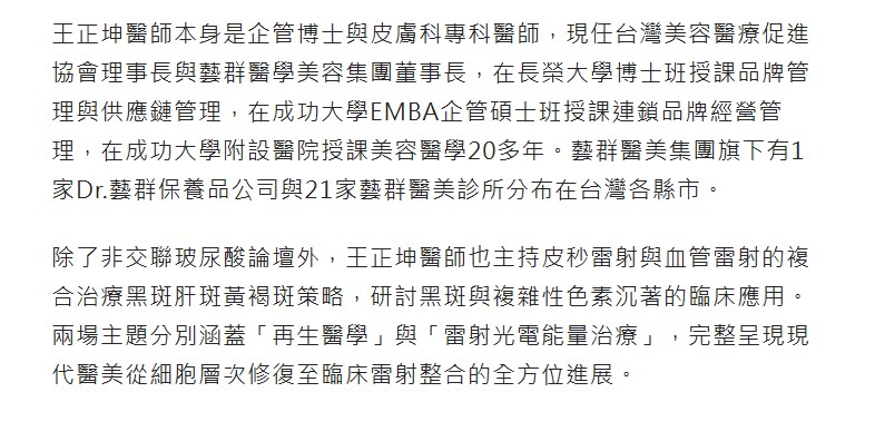 王正坤醫師本身是企管博士與皮膚科專科醫師,現任台灣美容醫療促進協會理事長與藝群醫學美容集團董事長,在長榮大學博士班授課品牌管理與供應鏈管理,在成功大學EMBA企管碩士班授課連鎖品牌經營管理,在成功大學附設醫院授課美容醫學20多年。藝群醫美集團旗下有1家Dr.藝群保養品公司與21家藝群醫美診所分布在台灣各縣市。