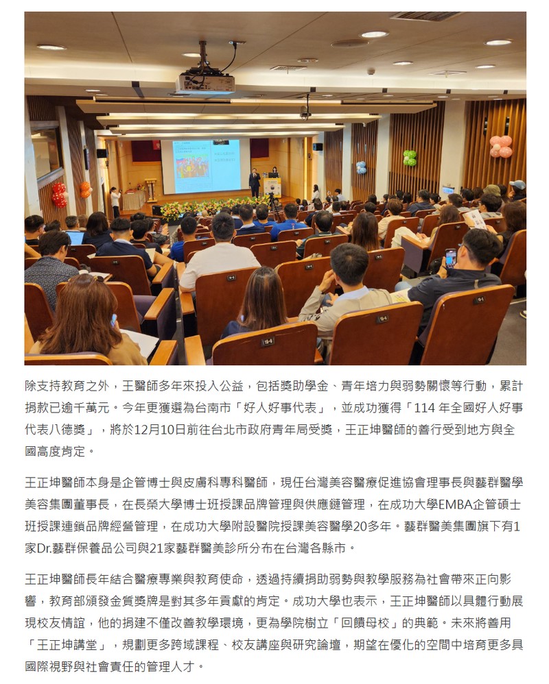 除支持教育之外,王醫師多年來投入公益,包括獎助學金、青年培力與弱勢關懷等行動,累計捐款已逾千萬元。今年更獲選為台南市「好人好事代表」,並成功獲得「114 年全國好人好事代表八德獎」,將於12月10日前往台北市政府青年局受獎,王正坤醫師的善行受到地方與全國高度肯定。