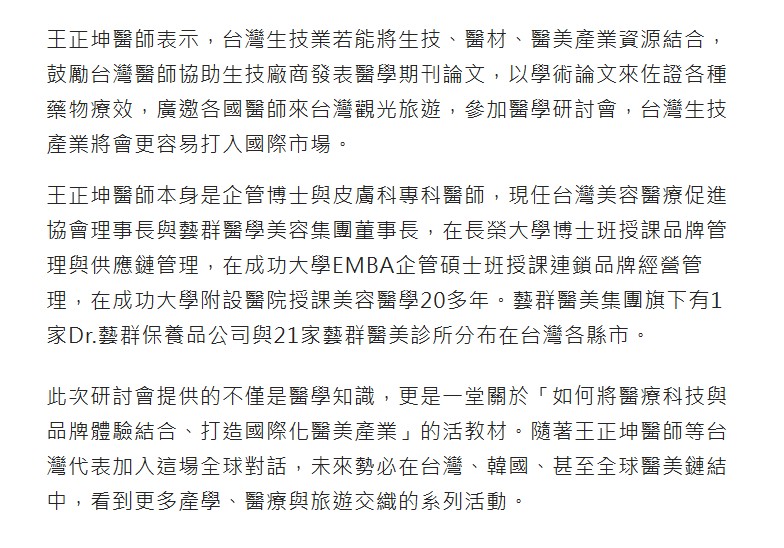 王正坤醫師表示,台灣生技業若能將生技、醫材、醫美產業資源結合,鼓勵台灣醫師協助生技廠商發表醫學期刊論文,以學術論文來佐證各種藥物療效,廣邀各國醫師來台灣觀光旅遊,參加醫學研討會,台灣生技產業將會更容易打入國際市場。