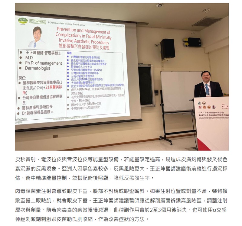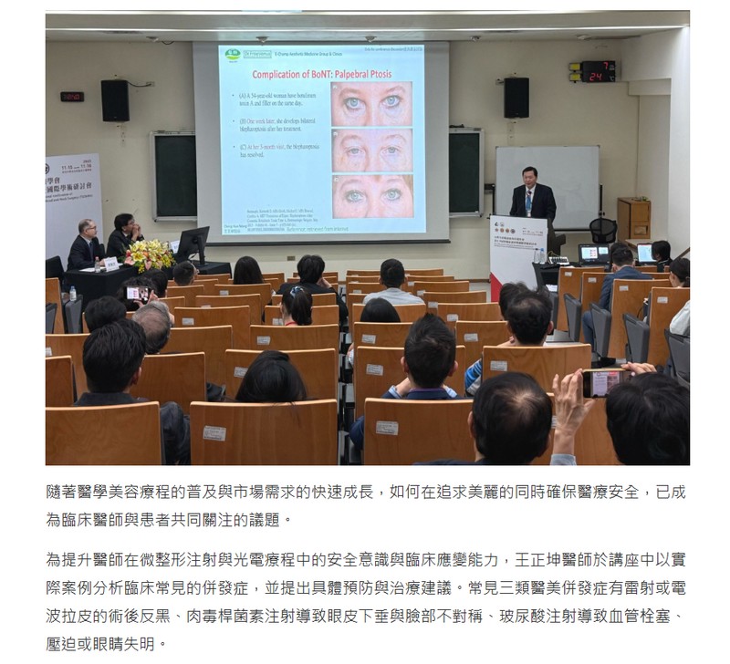 為提升醫師在微整形注射與光電療程中的安全意識與臨床應變能力,王正坤醫師於講座中以實際案例分析臨床常見的併發症,並提出具體預防與治療建議。常見三類醫美併發症有雷射或電波拉皮的術後反黑、肉毒桿菌素注射導致眼皮下垂與臉部不對稱、玻尿酸注射導致血管栓塞、壓迫或眼睛失明。