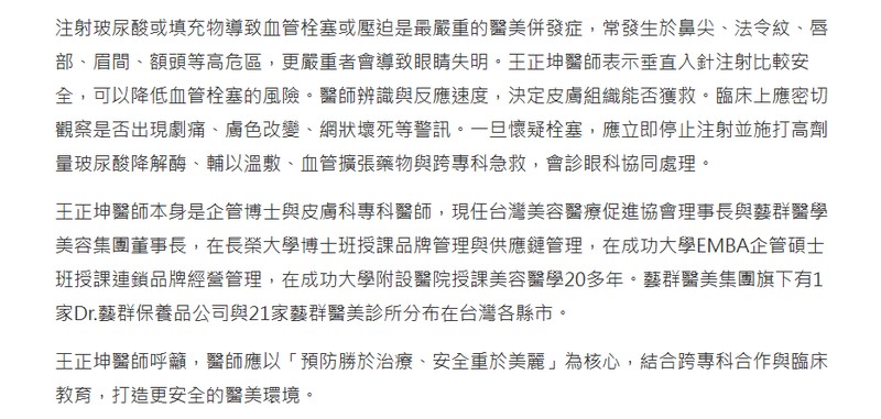 注射玻尿酸或填充物導致血管栓塞或壓迫是最嚴重的醫美併發症,常發生於鼻尖、法令紋、唇部、眉間、額頭等高危區,更嚴重者會導致眼睛失明。王正坤醫師表示垂直入針注射比較安全,可以降低血管栓塞的風險。醫師辨識與反應速度,決定皮膚組織能否獲救。臨床上應密切觀察是否出現劇痛、膚色改變、網狀壞死等警訊。一旦懷疑栓塞,應立即停止注射並施打高劑量玻尿酸降解酶、輔以溫敷、血管擴張藥物與跨專科急救,會診眼科協同處理。