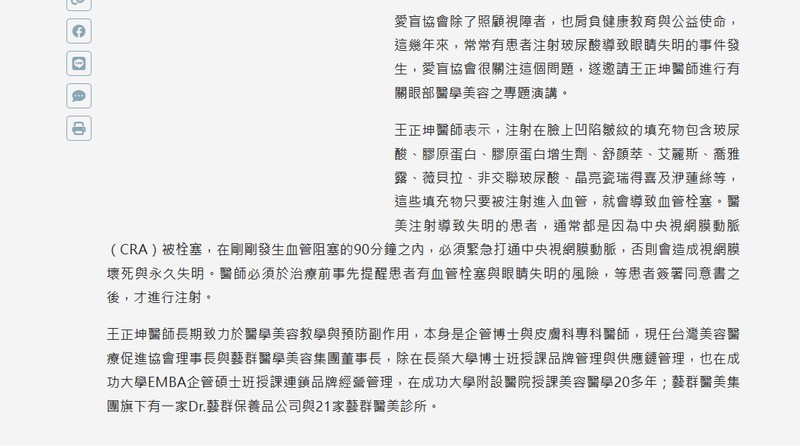愛盲協會除了照顧視障者,也肩負健康教育與公益使命,這幾年來,常常有患者注射玻尿酸導致眼睛失明的事件發生,愛盲協會很關注這個問題,遂邀請王正坤醫師進行有關眼部醫學美容之專題演講。