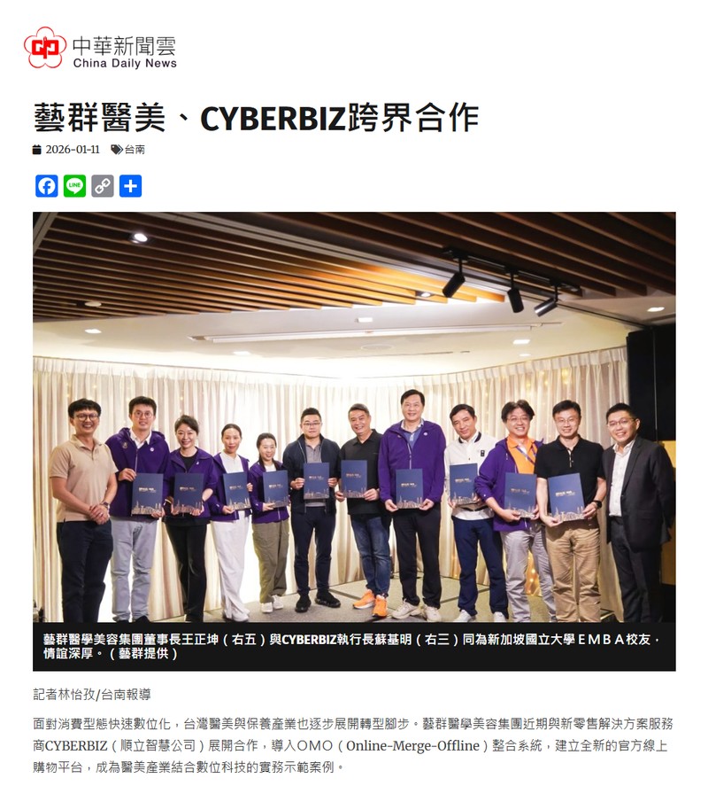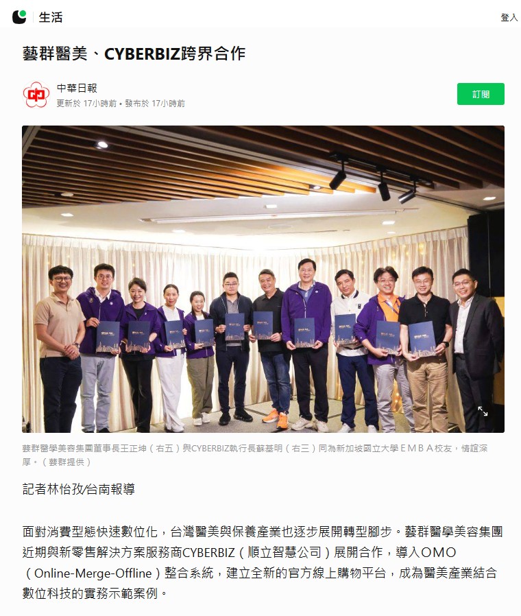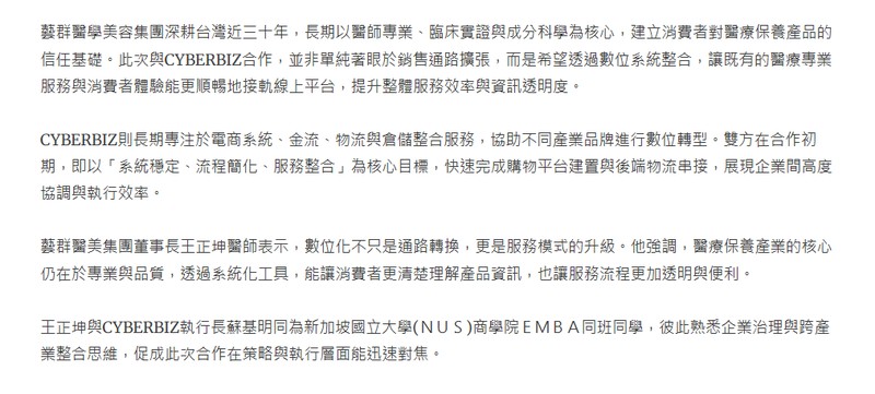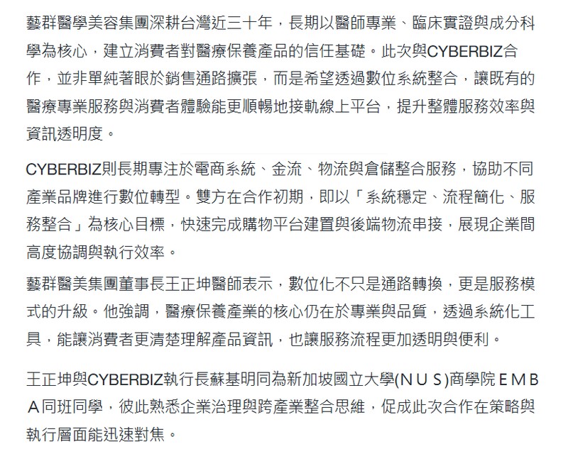 藝群醫學美容集團深耕台灣近三十年,長期以醫師專業、臨床實證與成分科學為核心,建立消費者對醫療保養產品的信任基礎。此次與CYBERBIZ合作,並非單純著眼於銷售通路擴張,而是希望透過數位系統整合,讓既有的醫療專業服務與消費者體驗能更順暢地接軌線上平台,提升整體服務效率與資訊透明度。