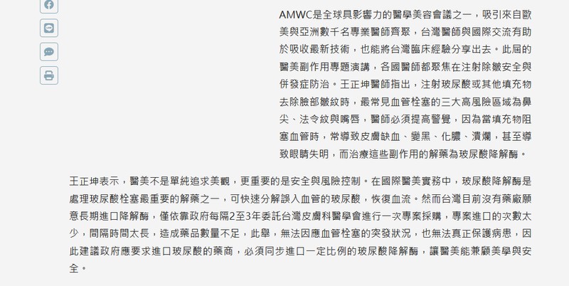 王正坤表示,醫美不是單純追求美觀,更重要的是安全與風險控制。在國際醫美實務中,玻尿酸降解酶是處理玻尿酸栓塞最重要的解藥之一,可快速分解誤入血管的玻尿酸,恢復血流。然而台灣目前沒有藥廠願意長期進口降解酶,僅依靠政府每隔2至3年委託台灣皮膚科醫學會進行一次專案採購,專案進口的次數太少,間隔時間太長,造成藥品數量不足,此舉,無法因應血管栓塞的突發狀況,也無法真正保護病患,因此建議政府應要求進口玻尿酸的藥商,必須同步進口一定比例的玻尿酸降解酶,讓醫美能兼顧美學與安全。