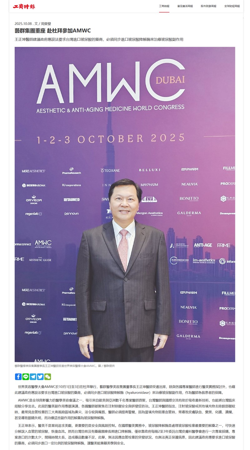 世界美容醫學大會AMWC於10月1日至3日在杜拜舉行,藝群醫學美容集團董事長王正坤醫師受邀出席,除與各國專業醫師進行醫美實務探討外,也藉此建議政府應設法要求台灣進口玻尿酸的藥商,必須同步進口玻尿酸降解酶(hyaluronidase)來治療玻尿酸副作用,作為醫師急救患者的保障。