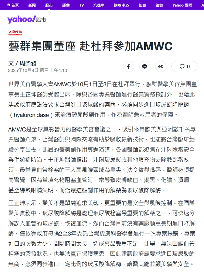 藝群集團董座 赴杜拜參加AMWC -王正坤醫師建議政府應設法要求台灣進口玻尿酸的藥商,必須同步進口玻尿酸降解酶來治療玻尿酸副作用 -工商時報-奇摩股市-中時新聞網