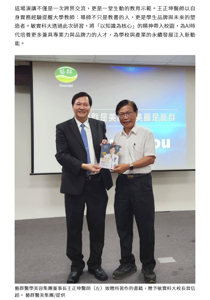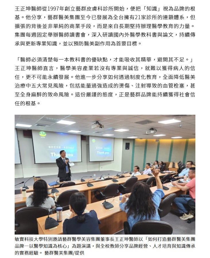 除了專業醫師身份,王正坤醫師同時擁有企管博士學位,長期在成功大學、長榮大學等校授課,跨足品牌管理、供應鏈與連鎖經營領域。他表示,無論是醫美診所或大學教育,其本質都在於「持續辦學、培養人才」。藝群醫美以診所為舞台,敏實科大則以校園為場域,但兩者共享同樣的核心價值:唯有不斷學習、不斷教育,才能累積品牌信賴並迎接長期挑戰。