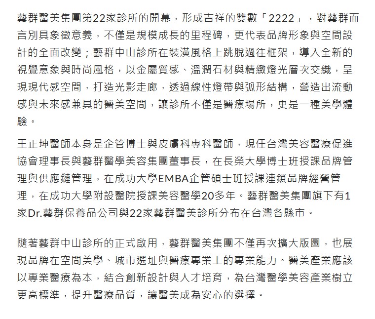 藝群醫美集團第22家藝群中山診所開幕 深耕捷運經濟學插旗台北中山區商圈 -新頭條新聞-享新聞-睿傳媒-奧丁丁新聞-在地人新聞LTVNews-coolbar Life生活誌-GOTHE 走.遊-屏東時報電子報-勢傳媒-台南時報-yam新聞 蕃薯藤新聞-PChome 新聞