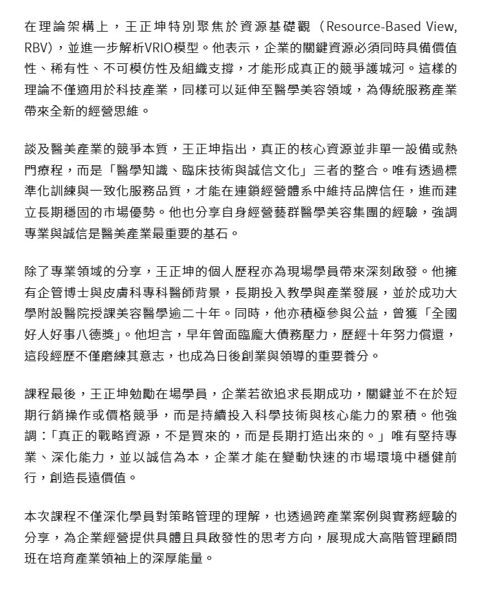 成功大學高階管理顧問班1日晚間舉辦專題課程,邀請藝群醫學美容集團董事長王正坤醫師擔任講座,於成功大學工業設計學系授課「管理策略與實務-以醫學美容產業為例」。課程聚焦企業如何在高度競爭環境中建立長期優勢,吸引多位企業高階主管與專業經理人到場參與,現場討論熱絡、互動踴躍。