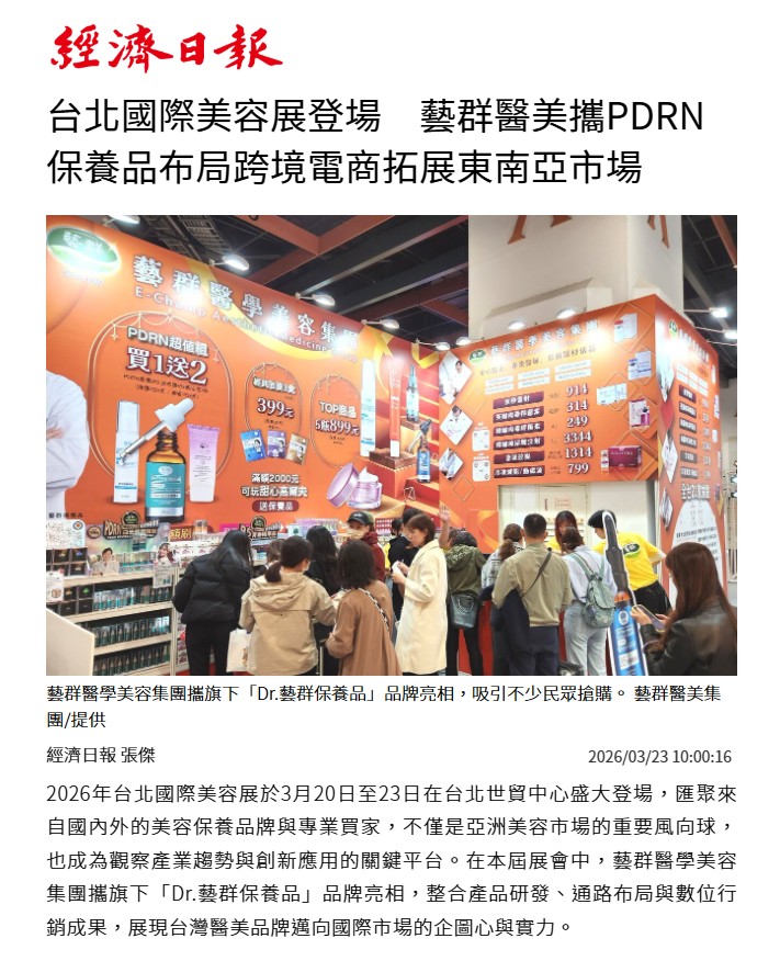 2026/03/23 台北國際美容展登場 藝群醫美攜PDRN保養品布局跨境電商拓展東南亞市場 -經濟日報 台北國際美容展登場 藝群醫美攜PDRN保養品布局跨境電商拓展東南亞市場 -經濟日報 https://money.udn.com/money/story/5635/9394787 藝群醫學美容集團攜旗下「Dr.藝群保養品」品牌亮相,吸引不少民眾搶購。 經濟日報 張傑2026/03/23 10:00:16 商情I熱門亮點 2026年台北國際美容展...