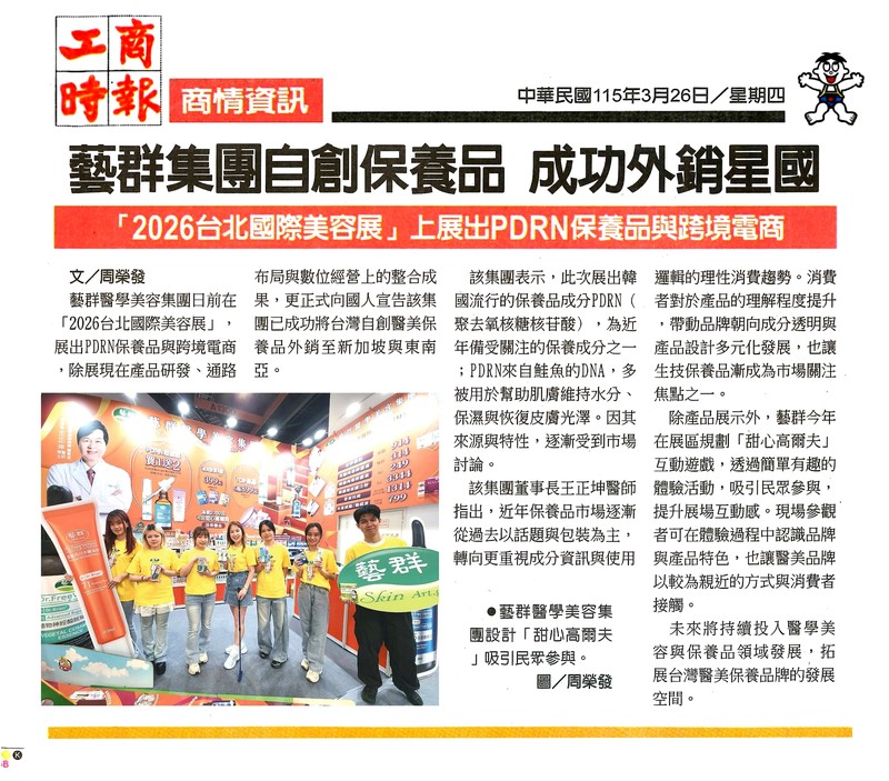 2026/03/26 藝群集團自創保養品 成功外銷星國 「2026台北國際美容展」上展出PDRN保養品與跨境電商 -工商時報-yahoo奇摩股市-中時新聞網 藝群集團自創保養品 成功外銷星國 「2026台北國際美容展」上展出PDRN保養品與跨境電商 -工商時報-yahoo奇摩股市-中時新聞網 https://www.ctee.com.tw/news/20260326700242-439901 -工商時報 https://tw.stock.yahoo.com/news/藝群集團自創保養品-成功外銷星國-201000226.html -yahoo奇...