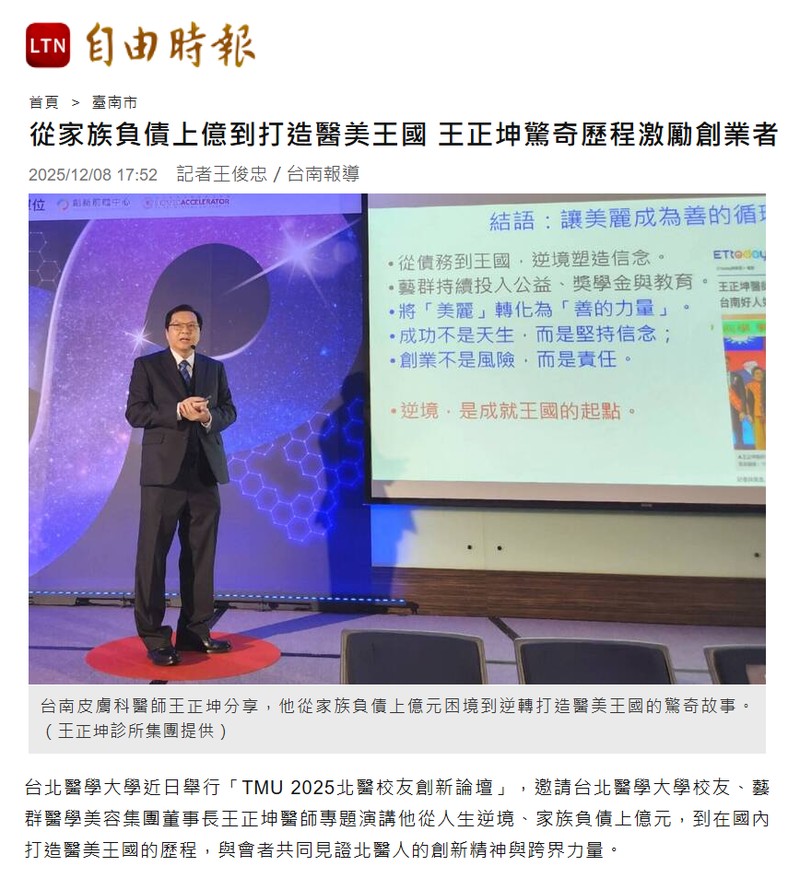 2025/12/08 從家族負債上億到打造醫美王國 王正坤驚奇歷程激勵創業者 -自由時報 從家族負債上億到打造醫美王國 王正坤驚奇歷程激勵創業者 -自由時報 https://news.ltn.com.tw/news/Tainan/breakingnews/5271701 記者王俊忠/台南報導2025/12/08 17:52 台南皮膚科醫師王正坤分享,他從家族負債上億元困境到逆轉打造醫美王國的驚奇故事。 台北醫學大學近日舉行「...