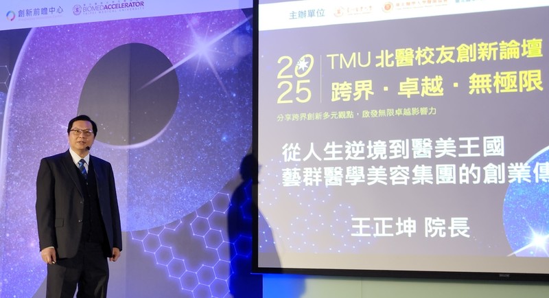 2025/12/08 標題: 從一億元債務到醫美王國 台北醫學大學邀請王正坤醫師現身說法 激勵無數創業者-2 標題: 從一億元債務到醫美王國 台北醫學大學邀請王正坤醫師現身說法 激勵無數創業者 台灣醫療科技展在南港展覽館一館盛大舉行,台北醫學大學於12月7日在展場舉辦「TMU 2025北醫校友創新論壇」,邀請台北醫學大學校友、藝群醫學美容集團董事長王正坤醫師進行專題演講《從人生逆境到醫美王...