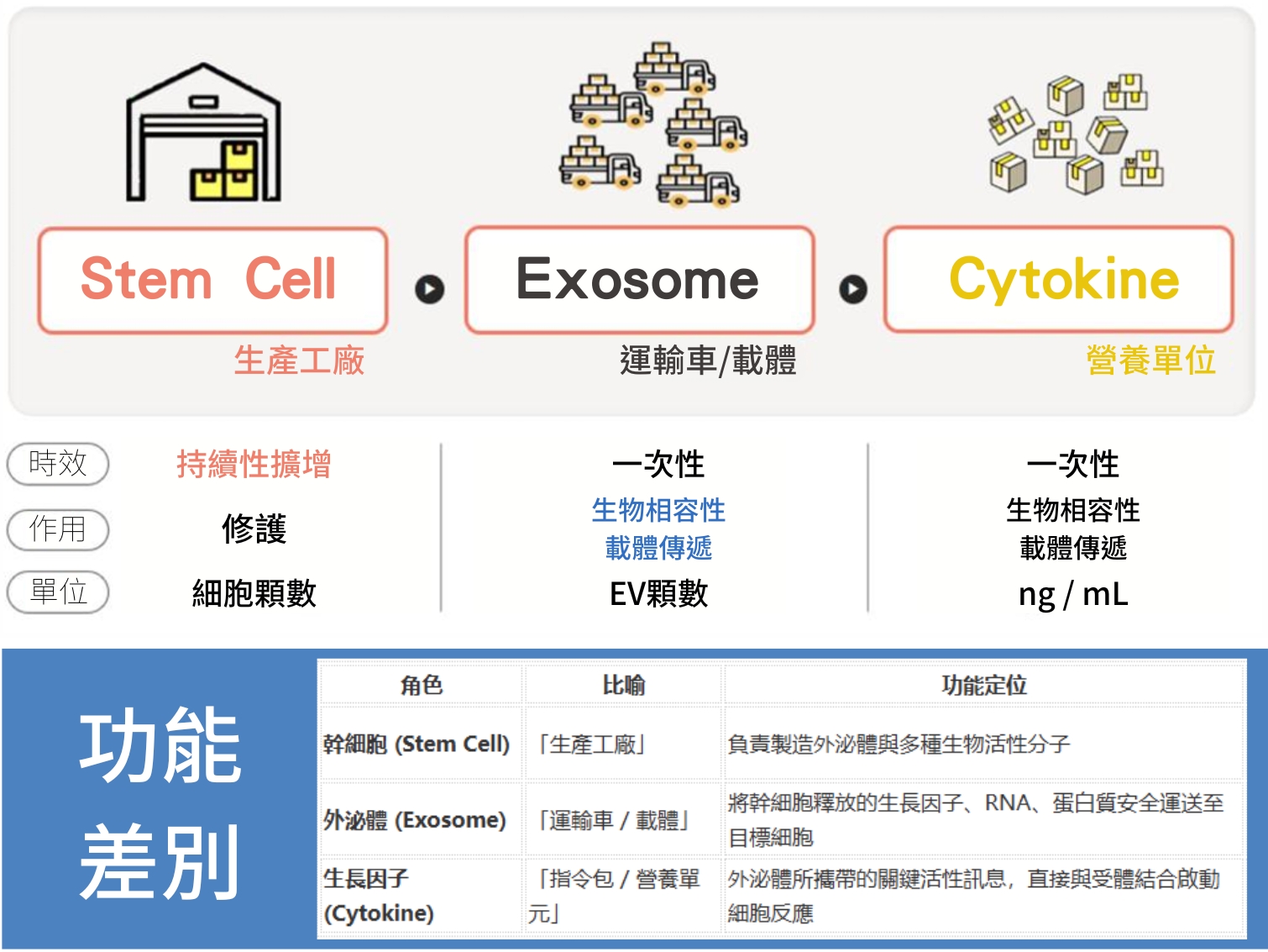外泌體則是這些幹細胞釋放出的「載體」,內含多種 生長因子(Cytokines )、蛋白質、RNA 等訊息分子,能將幹細胞的「修護指令」傳遞給其他細胞。