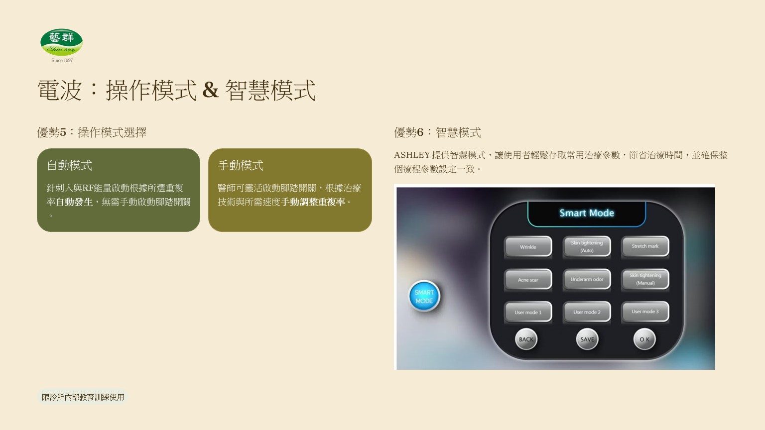 ▲智慧模式:讓使用者輕鬆存取常用治療參數,節省治療時間,並確保整個療程參數設定一致。
