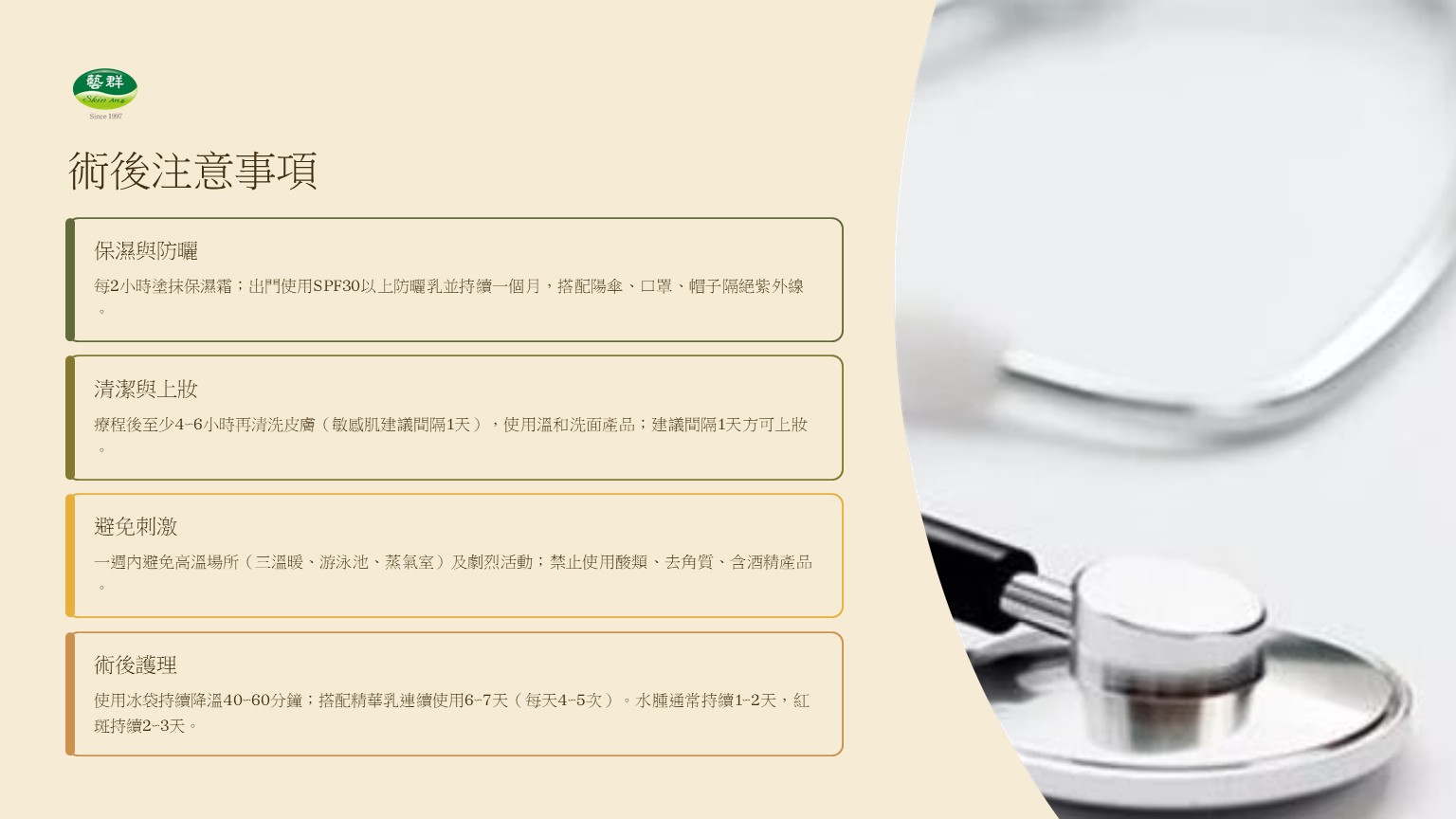 ▲避免刺激:一週內避免高溫場所(三溫暖、游泳池、蒸氣室)及劇烈活動;禁止使用酸類、去角質、含酒精產品。