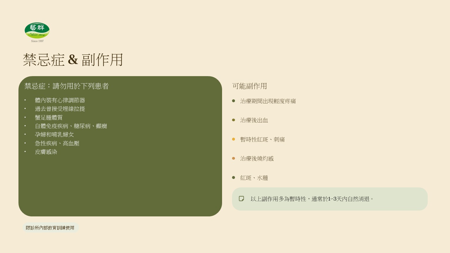 ▲特殊狀況告知:皮膚惡性腫瘤病史、慢性皮膚病、懷孕、體內金屬植入物、心臟疾病、癲癇、靜脈曲張、金屬過敏者,請事先告知確認。