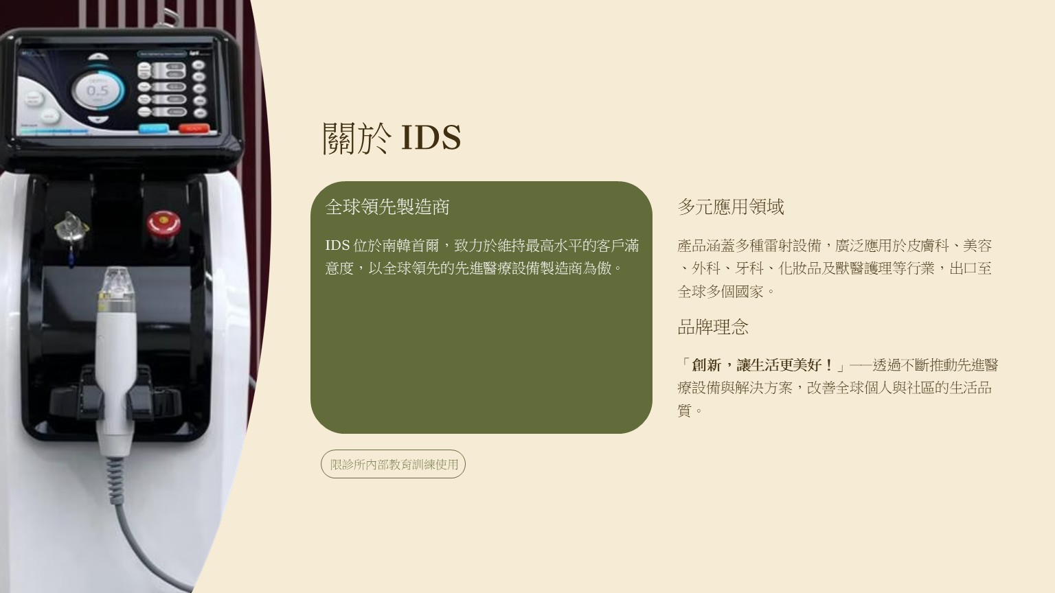IDS 位於南韓首爾,致力於維持最高水平的客戶滿意度,以全球領先的先進醫療設備製造商為傲,產品涵蓋多種雷射設備,廣泛應用於皮膚科、美容、外科、牙科、化妝品及獸醫護理等行業,出口至全球多個國家。
