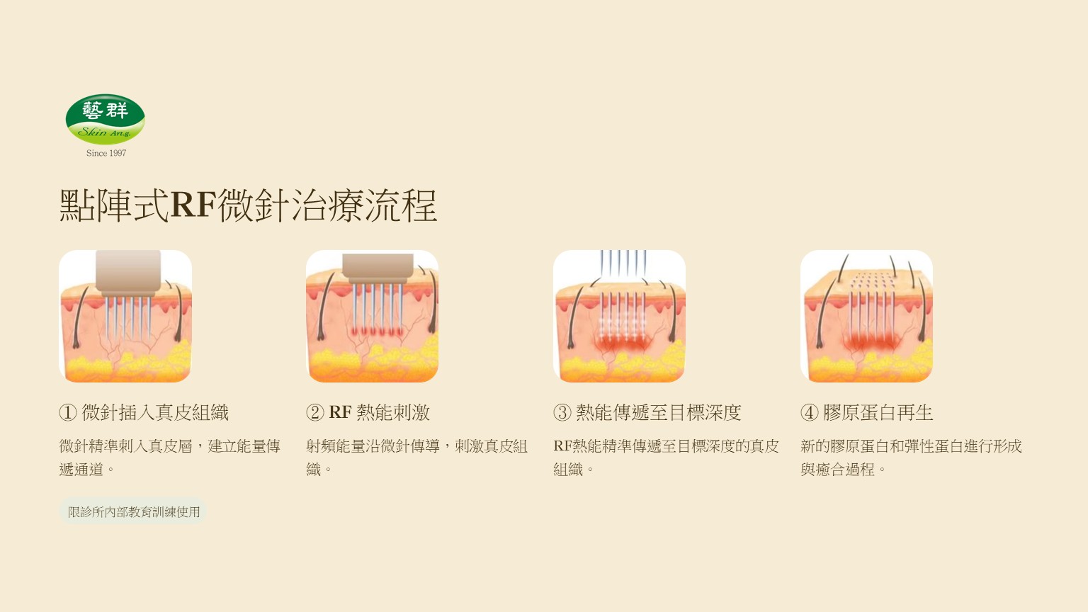 ▲ 點陣式RF微針的優勢:使用絕緣微針直接穿透真皮層,不損害皮膚表層,RF能量精準傳遞至皮膚深層,促進膠原蛋白生成與皮膚修復。