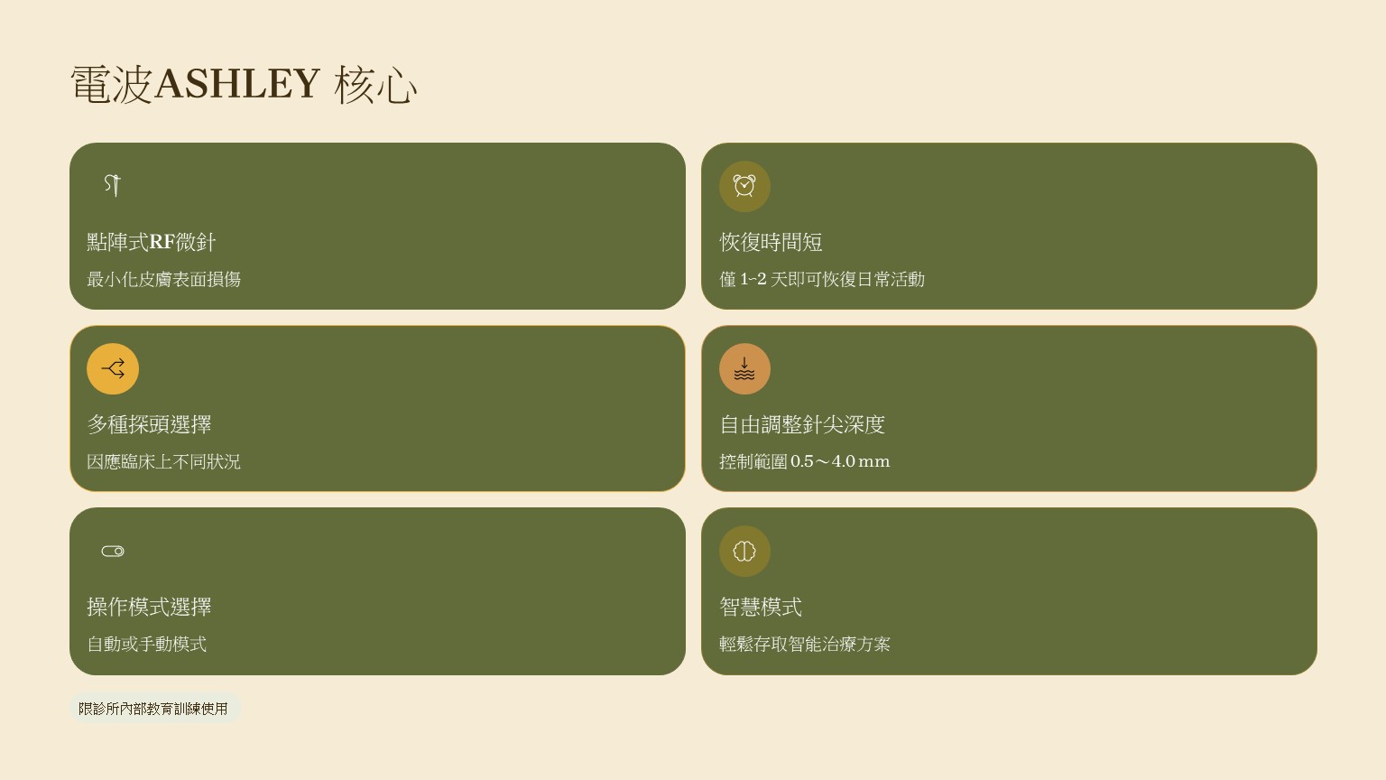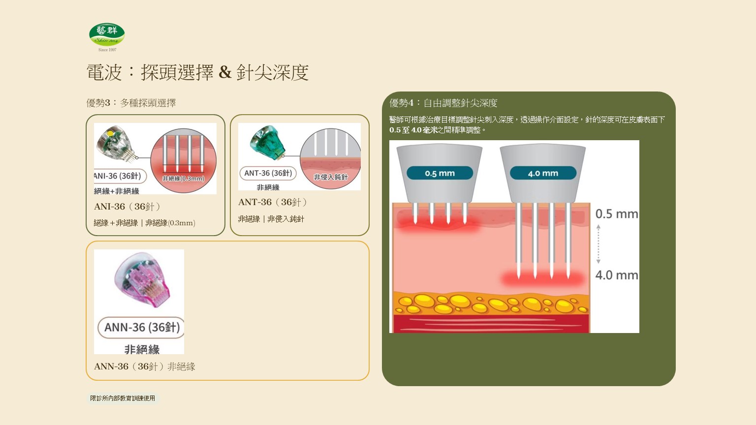 多種探頭選擇,且醫師可根據治療目標調整針尖刺入深度,透過操作介面設定,針的深度可在皮膚表面下 0.5 至 4.0 毫米之間精準調整。