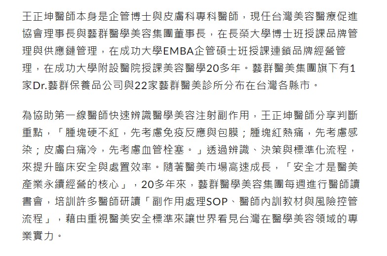 王正坤醫師本身是企管博士與皮膚科專科醫師,現任台灣美容醫療促進協會理事長與藝群醫學美容集團董事長,在長榮大學博士班授課品牌管理與供應鏈管理,在成功大學EMBA企管碩士班授課連鎖品牌經營管理,在成功大學附設醫院授課美容醫學20多年。藝群醫美集團旗下有1家Dr.藝群保養品公司與22家藝群醫美診所分布在台灣各縣市。