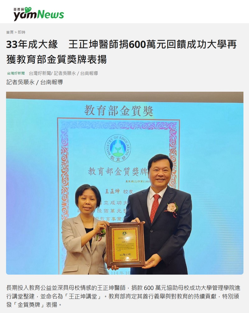 https://www.taiwanhot.net/news/1119859/33年成大緣+王正坤醫師捐600萬元回饋成功大學再獲教育部金質獎牌表揚 -台灣好新聞