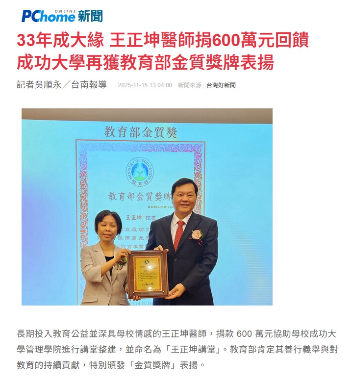 33年成大緣 王正坤醫師捐600萬元回饋成功大學再獲教育部金質獎牌表揚 -台灣好新聞-TDN善思新聞網-蕃新聞-PChome新聞