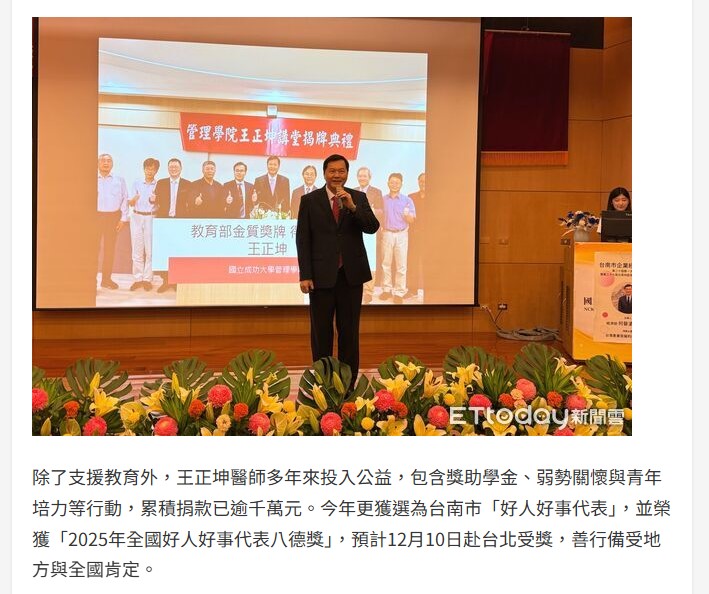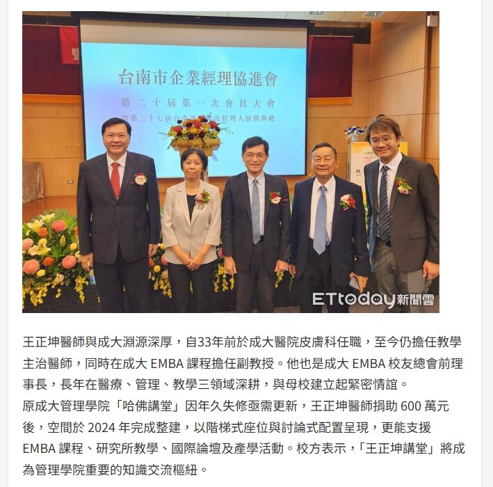 王正坤不僅是皮膚科專科醫師,也擁有企管博士背景,現任台灣美容醫療促進協會理事長,並長期在多所大專院校授課。他所領軍的藝群醫美集團,旗下21家醫美診所遍佈全臺,並設有保養品公司,推動產學與臨床並進。