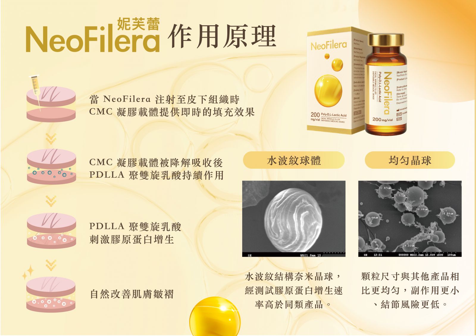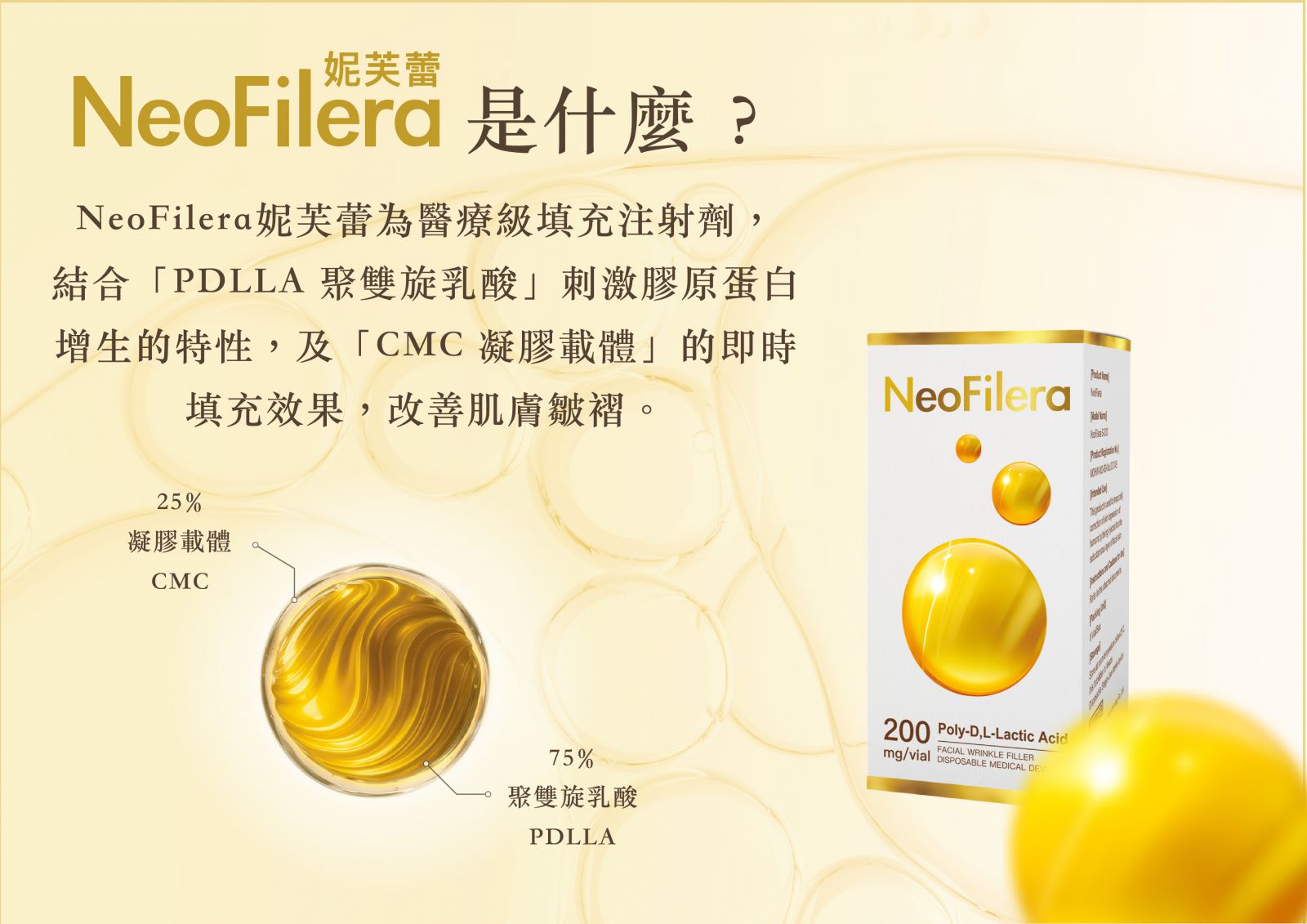 NeoFilera是一款填補肌膚老化凹陷、啟動膠原蛋白增生的皮下填補注射劑。PDLLA是一種可持續刺激膠原蛋白增生的材料,效果可持續長達18至24個月,有助於逐步改善皮膚結構。結合「PDLLA (Poly-D,L-Lactic Acid)聚雙旋乳酸」刺激膠原蛋白增生的特性,及「CMC(Carboxymethyl Cellulose)羧甲基纖維素」的即時填充,有助於減少皺紋和細紋,改善皮膚的質地和彈性,讓肌膚重拾緊緻與彈潤。