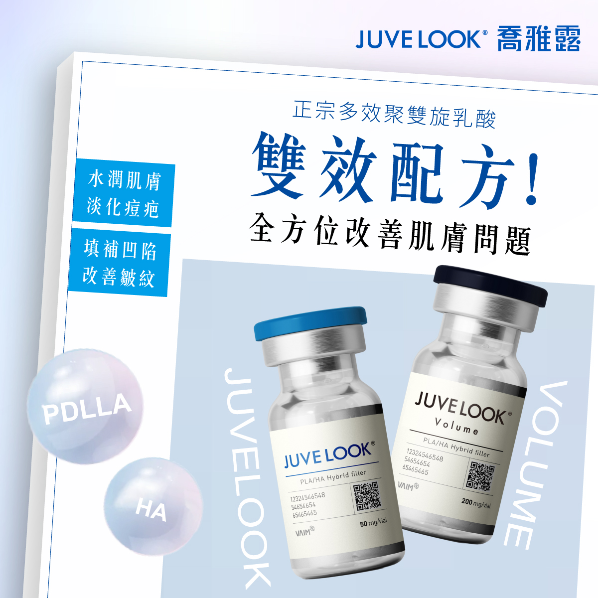 Juvelook喬雅露依照不同分子大小與適用情況,推出兩種不同劑型:Juvelook 50mg為小分子劑型與Lenisna 200mg大分子劑型,兩者均使用相同濃度之聚雙旋乳酸與玻尿酸結合而成,但兩者的微粒尺寸並不相同。