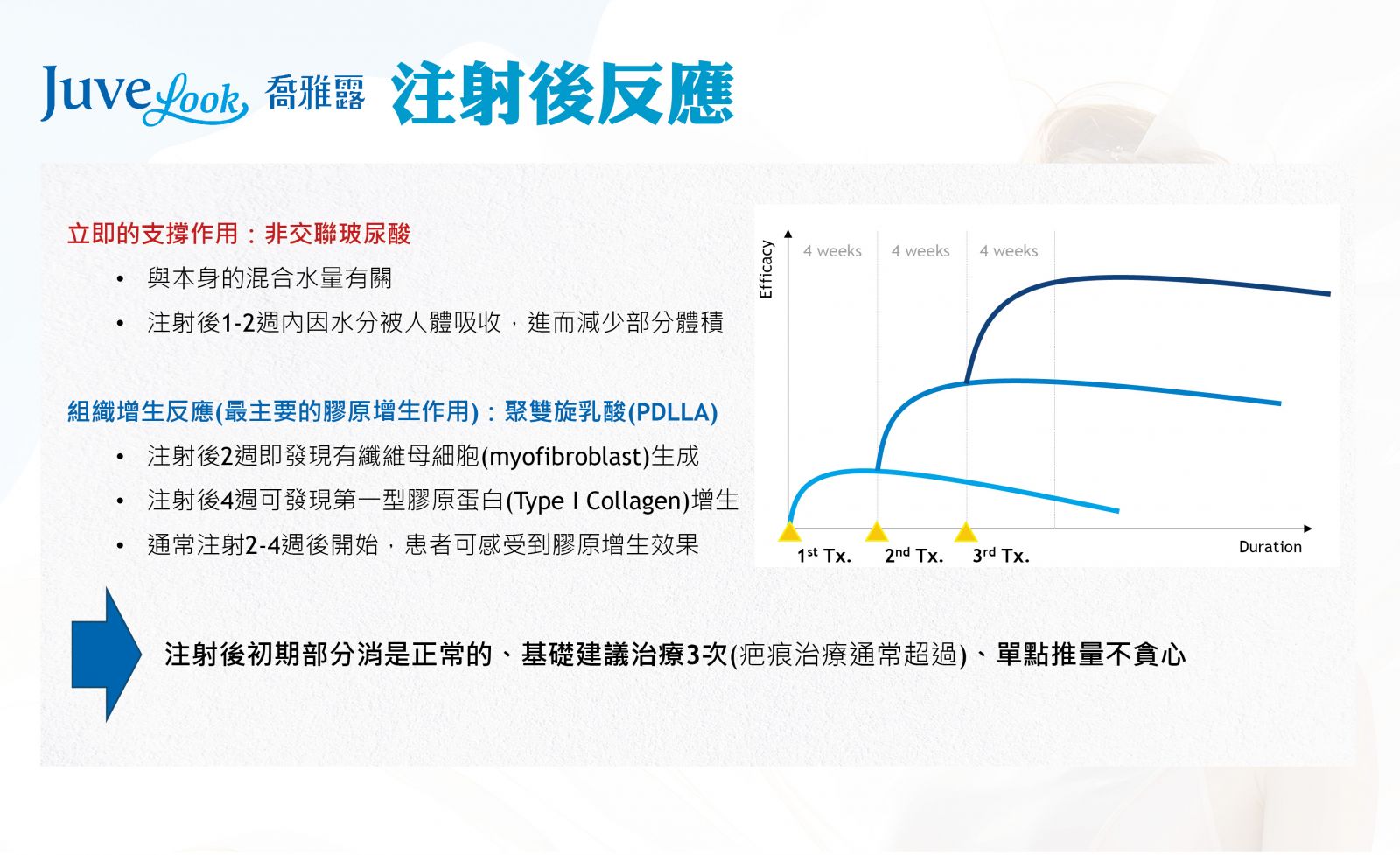 ● 膠原蛋白新生:注射2-4週後,透由聚雙旋乳酸PDLLA與人體組織相結合,膠原蛋白、彈性纖維等相關蛋白開始生成,幫助肌膚達到飽滿、澎潤與淡化皺紋、細紋等功效。