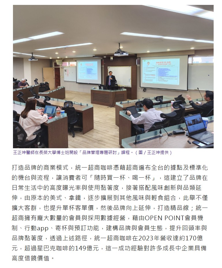 長榮大學博士班為深化企業品牌經營,特別聘請藝群醫學美容集團董事長暨知名醫美產業領導者王正坤醫師於長榮大學經營管理博士班開設「品牌管理專題研討」課程,課程採每週授課,協助博士學生結合企管理論與實務,學習如何打造知名品牌,王正坤醫師以「品牌金字塔」的模型來授課,並以台灣統一超商咖啡CITY CAFE為實例,解析其如何從平價入門咖啡一路躍升至數百億元營收,成為企業品牌典範。
