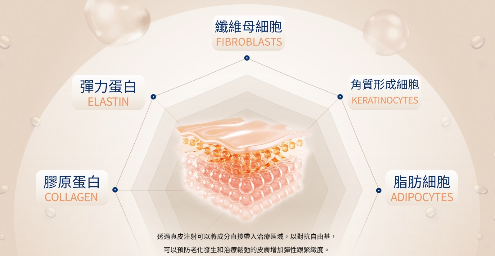 ✅低分子量 HA : 促進纖維母細胞(fibroblasts)、角質細胞(keratinocytes)與脂肪幹細胞(adipocytes)的活化,誘導膠原蛋白與彈力蛋白的生成。