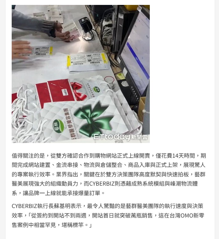 值得關注的是,從雙方確認合作到購物網站正式上線開賣,僅花費14天時間,期間完成網站建置、金流串接、物流與倉儲整合、商品入庫與正式上架,展現驚人的專案執行效率。業界指出,關鍵在於雙方決策團隊高度默契與快速拍板,藝群醫美展現強大的組織動員力,而CYBERBIZ則憑藉成熟系統模組與峰潮物流體系,讓品牌一上線就能承接爆量訂單。