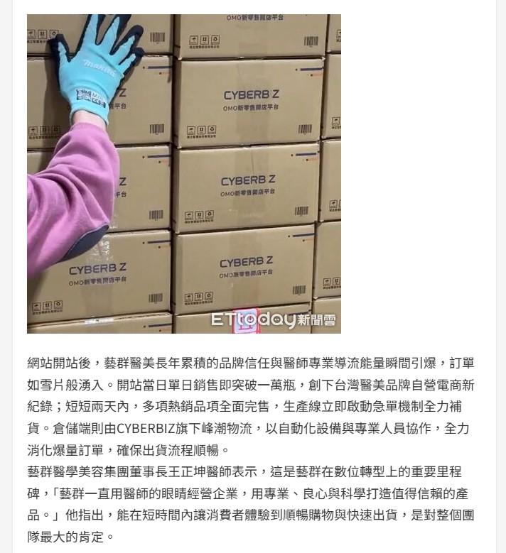 網站開站後,藝群醫美長年累積的品牌信任與醫師專業導流能量瞬間引爆,訂單如雪片般湧入。開站當日單日銷售即突破一萬瓶,創下台灣醫美品牌自營電商新紀錄;短短兩天內,多項熱銷品項全面完售,生產線立即啟動急單機制全力補貨。倉儲端則由CYBERBIZ旗下峰潮物流,以自動化設備與專業人員協作,全力消化爆量訂單,確保出貨流程順暢。