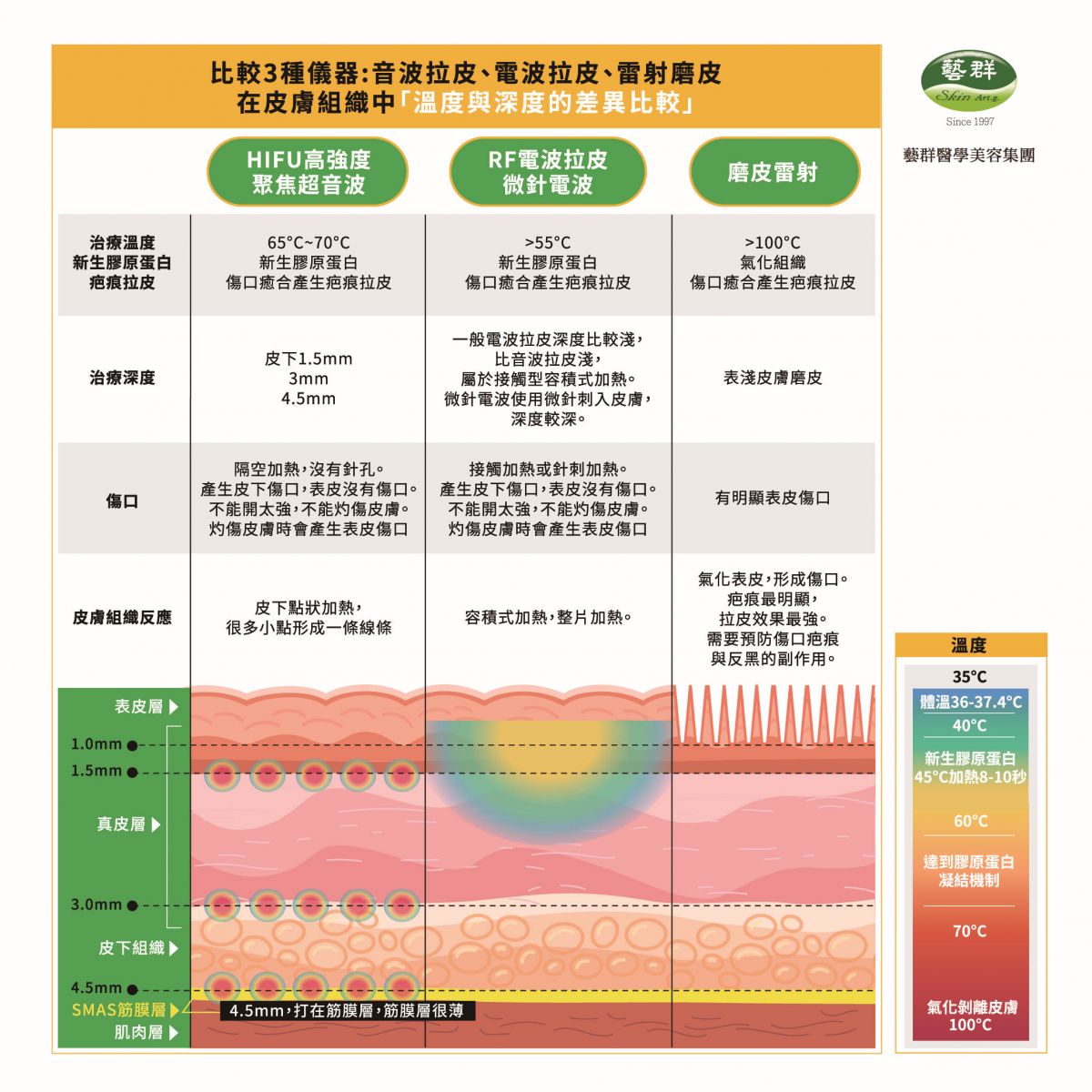 ▲ 點陣式RF微針的優勢:使用絕緣微針直接穿透真皮層,不損害皮膚表層,RF能量精準傳遞至皮膚深層,促進膠原蛋白生成與皮膚修復。