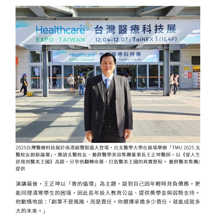2025台灣醫療科技展於南港展覽館盛大登場,台北醫學大學在展場舉辦「TMU 2025 北醫校友創新論壇」,邀請北醫校友、藝群醫學美容集團董事長王正坤醫師,以《從人生逆境到醫美王國》為題,分享他翻轉命運、打造醫美王國的真實歷程。現場座無虛席,許多校友、創業者與醫界人士紛紛表示,這場演講不只是一段創業故事,更是一堂生命課。